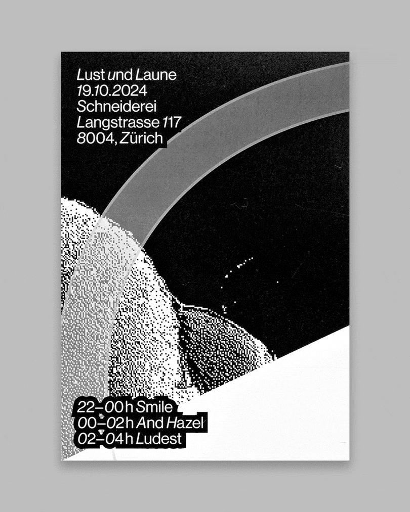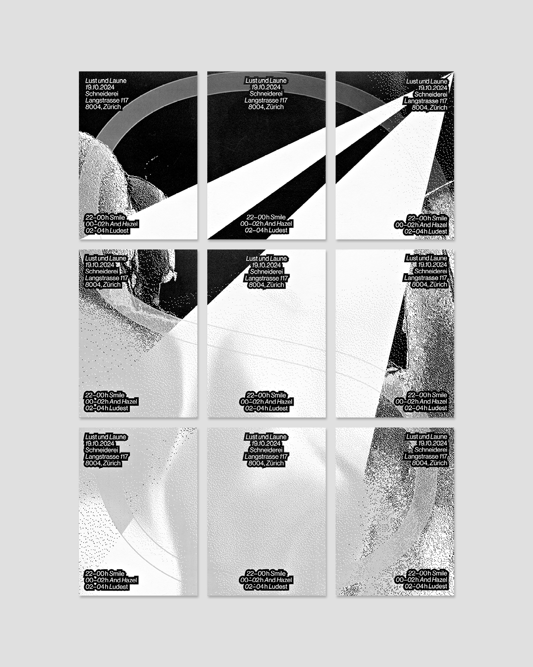 Für die Promo-Kampagne des Events wurden verschiedene Umsetzungen mit Leitidee realisiert: Ein Keyvisual für alle Anwendungen, Plakate, Flyer und SoMe-Posts inkl. Gewinnspiel-Schnitzeljagd für einen gratis Eintritt. Die Idee war es, ein Plakat zu gestalten, welches verschnitten individuelle Flyer ergibt; Heisst, das Plakat ist so aufgebaut, dass man es in neun unabhängig voneinander funktionierende Sujets unterteilen kann. Die Flyer wurden an verschiedenen Standorten in der Stadt Zürich und Umgebung verteilt. Hatte jemand alle neun Teile bei sich, konnte er/sie ohne Eintritt zu zahlen an die Veranstaltung. Die Promo-Kampagne nimmt so starken inhaltlichen Bezug zur Location und integriert diesen als tragendes Kernelement der kommunikativen Leitidee. Des weiteren wurden in der Gestaltung weitere visuelle Referenzen zur Schneiderei und Nachtleben geschaffen. Das Endresultat ist eine modulare Gestaltung, welche sich über die gesamte Kampagne ohne grossen Effort adaptieren lässt, ohne erzwungen oder sperrig zu wirken.